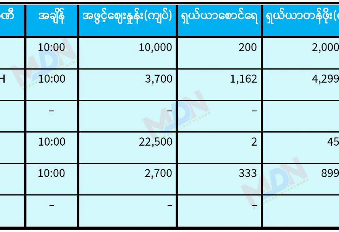 နိုဝင်ဘာ ၄ ရက် ရန်ကုန်စတော့ အိတ်ချိန်းရှယ်ယာ အဖွင့်ဈေးနှုန်းများ