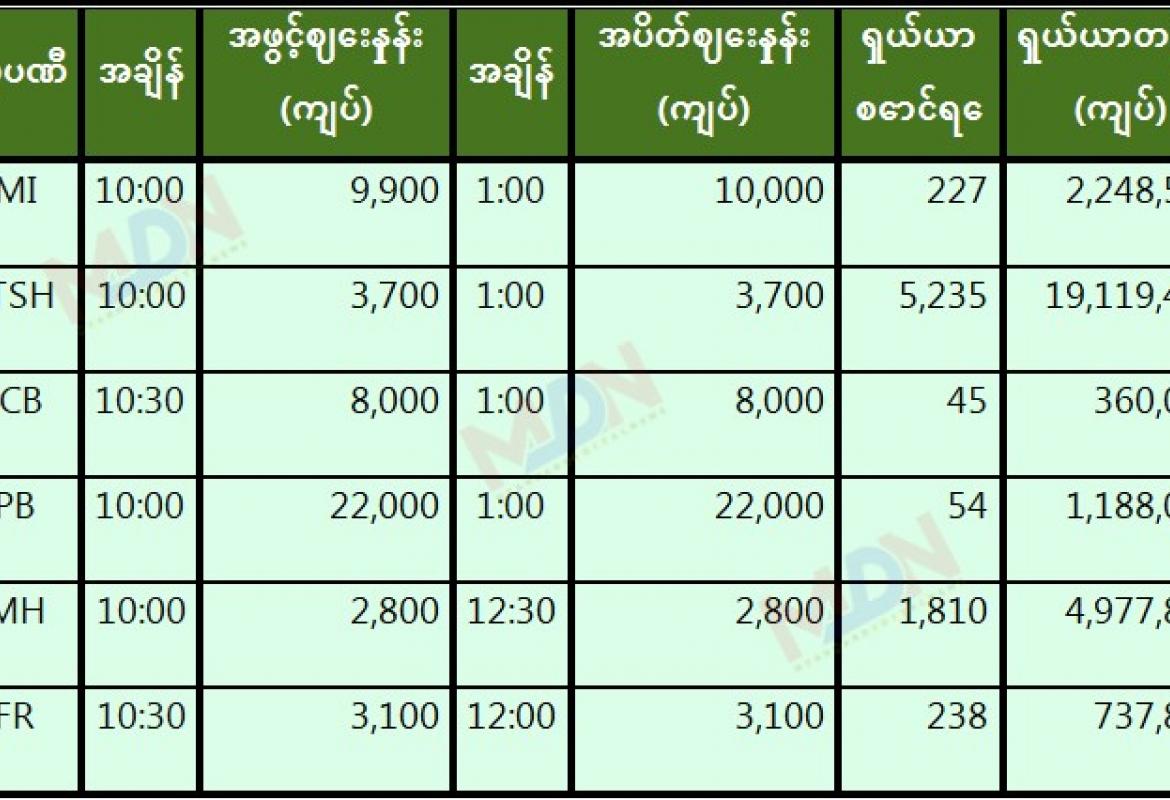 အောက်တိုဘာ ၁၉ ရက် ရန်ကုန်စတော့ အိတ်ချိန်းရှယ်ယာ အဖွင့်ဈေးနှုန်းများ