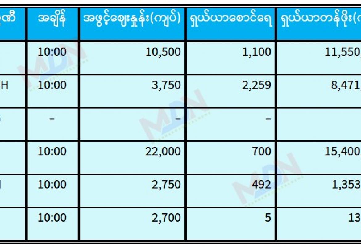 ဇူလိုင် ၈ ရက် ရန်ကုန်စတော့ အိတ်ချိန်းရှယ်ယာ အဖွင့်ဈေးနှုန်းများ