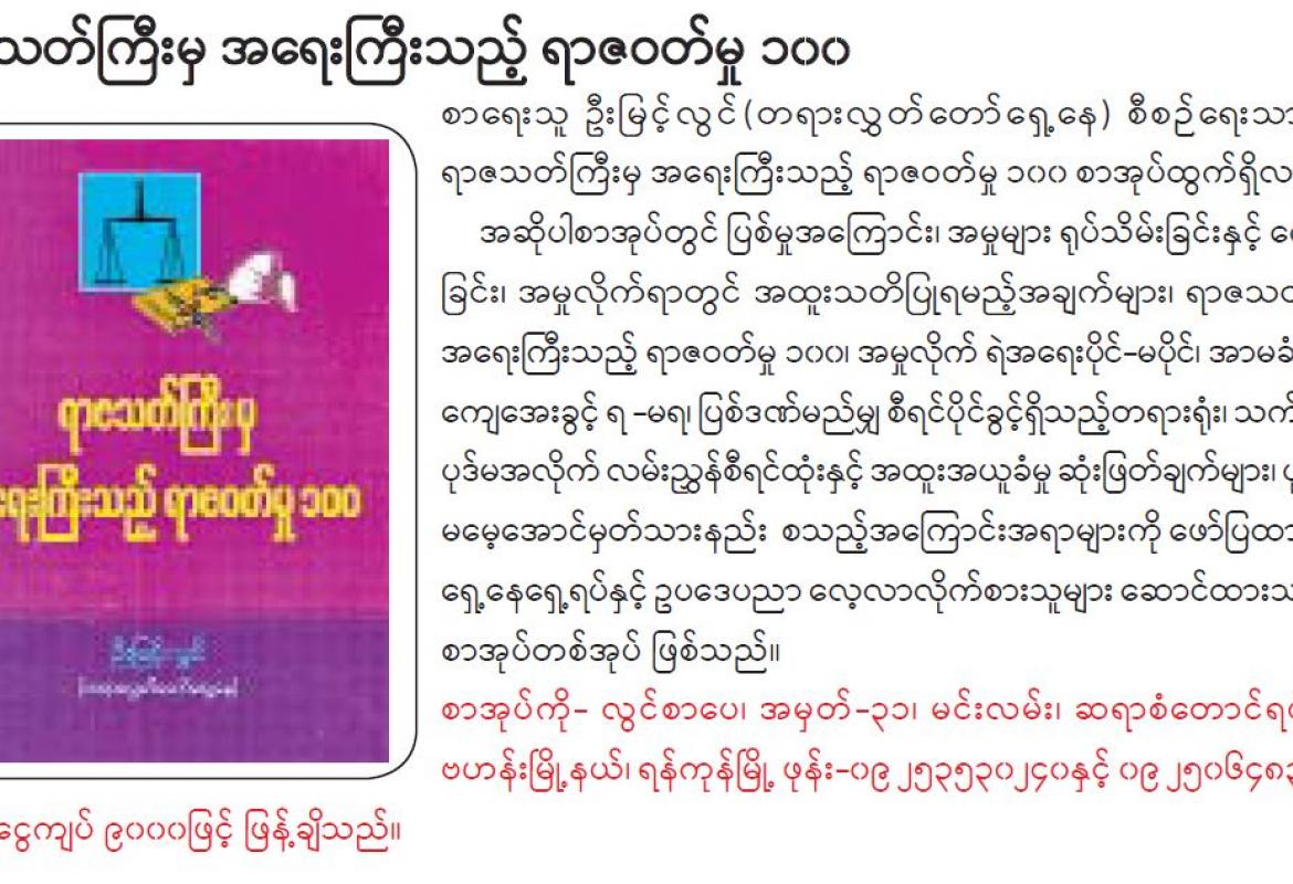 ရာဇသတ်ကြီးမှ အရေးကြီးသည့် ရာဇဝတ်မှု ၁၀၀ စာအုပ်ထွက်ရှိ