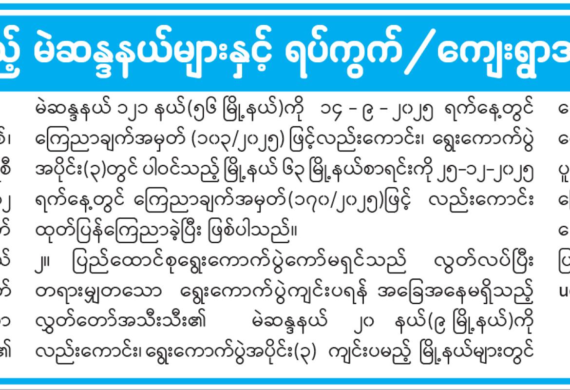 ရွေးကောက်ပွဲကျင်းပခြင်းမပြုမည့် မဲဆန္ဒနယ်များနှင့် ရပ်ကွက်/ကျေးရွာအုပ်စုများ ထုတ်ပြန်ကြေညာခြင်း