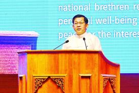 NCA (၁၀) နှစ်ပြည့် နှစ်ပတ်လည်နေ့အခမ်းအနားတွင် ပြည်ထောင်စုသမ္မတမြန်မာနိုင်ငံတော် ယာယီသမ္မတ နိုင်ငံတော်လုံခြုံရေးနှင့် အေးချမ်းသာယာရေးကော်မရှင် ဥက္ကဋ္ဌ တပ်မတော်ကာကွယ်ရေးဦးစီးချုပ် ဗိုလ်ချုပ်မှူးကြီး မင်းအောင်လှိုင် ပြောကြားသည့် အဖွင့်မိန့်ခွန်း