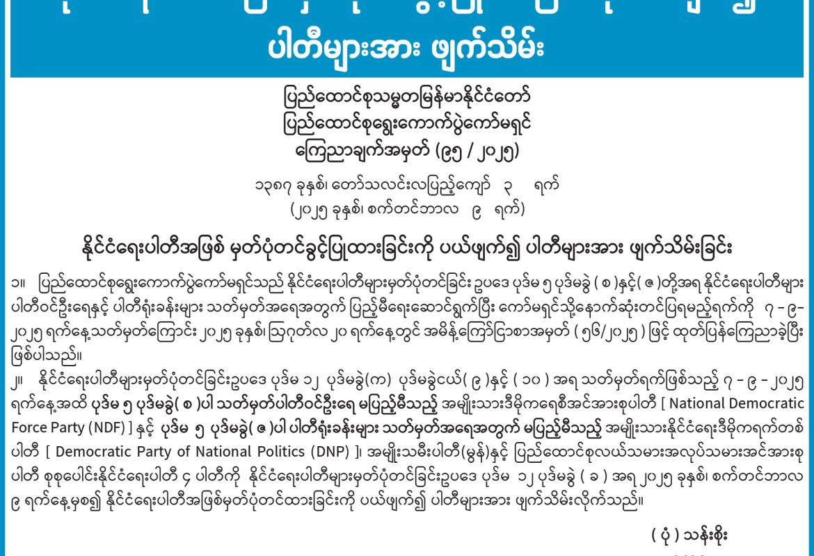 နိုင်ငံရေးပါတီအဖြစ် မှတ်ပုံတင်ခွင့်ပြုထားခြင်းကို ပယ်ဖျက်၍ ပါတီများအား ဖျက်သိမ်း