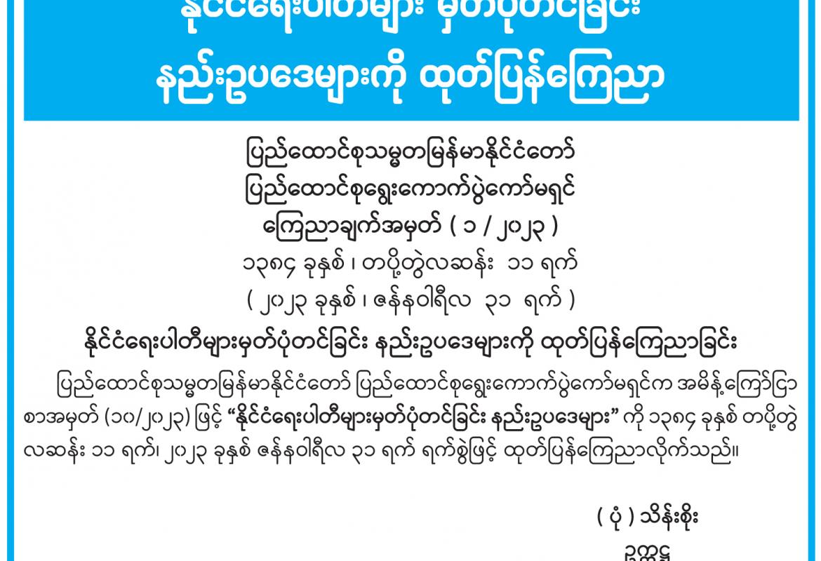 နိုင်ငံရေးပါတီများ မှတ်ပုံတင်ခြင်း နည်းဥပဒေများကို ထုတ်ပြန်ကြေညာ