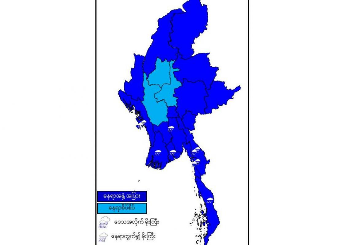 မနက်ဖြန်နံနက်အထိ ခန့်မှန်းချက်မှာ စစ်ကိုင်းတိုင်းဒေသကြီးအောက်ပိုင်း၊ မန္တလေးတိုင်းဒေသကြီးနှင့် မကွေးတိုင်း ဒေသကြီးတို့တွင် နေရာစိပ်စိပ်နှင့် ကျန်တိုင်းဒေသကြီးနှင့် ပြည်နယ်တို့တွင် နေရာအနှံ့အပြား မိုးထစ်ချုန်းရွာပြီး ရခိုင်ပြည်နယ်၊ ကရင်ပြည်နယ်နှင့် မွန်ပြည်နယ်တို့တွင် ဒေသအလိုက်နှင့် ပဲခူးတိုင်းဒေသကြီး၊ ရန်ကုန်တိုင်း ဒေသကြီး၊ ဧရာဝတီတိုင်းဒေသကြီးနှင့် တနင်္သာရီတိုင်းဒေသကြီးတို့တွင် နေရာကွက်၍ မိုးကြီးနိုင်သည်။ ရွာရန်ရာနှုန်းပြည့်ဖြစ်သည်။