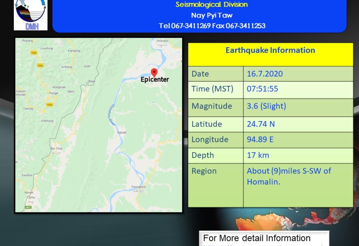 ယနေ့နံနက် ၇ နာရီ ၅၁ မိနစ်တွင် ဟုမ္မလင်းမြို့၏ တောင်-အနောက်တောင်ဘက် (၉) မိုင်ခန့်အကွာကို ဗဟိုပြု၍ အင်အား ရစ်(ခ်)တာစကေး ၃ ဒသမ ၆ အဆင့်ရှိ အင်အားအနည်းငယ်ရှိ မြေငလျင်တစ်ခု လှုပ်ရှားသွားကြောင်း .............