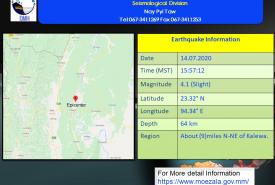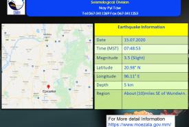 ၂၀၂၀ ပြည့်နှစ်၊ ဇူလိုင်လ (၁၅)ရက်နေ့၊ မြန်မာစံတော်ချိန် (၀၇)နာရီ၊ (၄၈)မိနစ်၊ (၅၃)စက္ကန့် အချိန်တွင် မန္တလေးမြေငလျင်စခန်းမှ တောင်ဘက် (၇၁)မိုင် ခန့်ကွာဝေးသော မြန်မာနိုင်ငံ ပြည်တွင်း (ဝမ်းတွင်းမြို့၏ အရှေ့တောင်ဘက် (၁၀)မိုင် ခန့်အကွာ) မြောက်လတ္တီတွဒ် (၂၀.၉၈)ဒီဂရီ၊ အရှေ့လောင်ဂျီတွဒ် (၉၆.၁၁)ဒီဂရီ၊ အနက် (၅)ကီလိုမီတာကို ဗဟိုပြု၍ အင်အား ရစ်(ခ်)တာစကေး (၃.၅) အဆင့်ရှိ အင်အားအနည်းငယ်ရှိသော မြေငလျင်တစ်ခု လှုပ်ရှားသွားကြောင်း တိုင်းထွာရရှိ