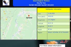 ၂၀၂၀ ပြည့်နှစ်၊ ဇွန်လ(၁၁) ရက်နေ့၊ မြန်မာစံတော်ချိန် (၁၆) နာရီ၊ (၀၁) မိနစ်၊ (၅၅)စက္ကန့် အချိန်တွင် တမူးမြေငလျင်စခန်းမှ အရှေ့မြောက်ဘက် မိုင်(၆၀)ခန့်ကွာဝေးသော ..............