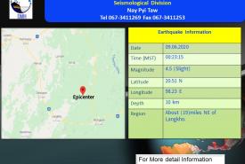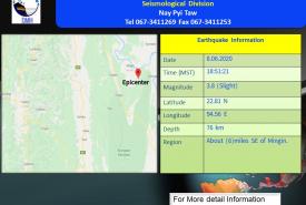 ၂၀၂၀ ပြည့်နှစ်၊ ဇွန်လ (၈) ရက်နေ့၊ မြန်မာစံတော်ချိန် (၁၈) နာရီ၊ (၅၁) မိနစ်၊ (၂၁)စက္ကန့် အချိန်တွင် ဟားခါးမြေငလျင်စခန်းမှ အရှေ့-အရှေ့မြောက်ဘက် (၆၂) မိုင်ခန့်ကွာဝေးသော ..............