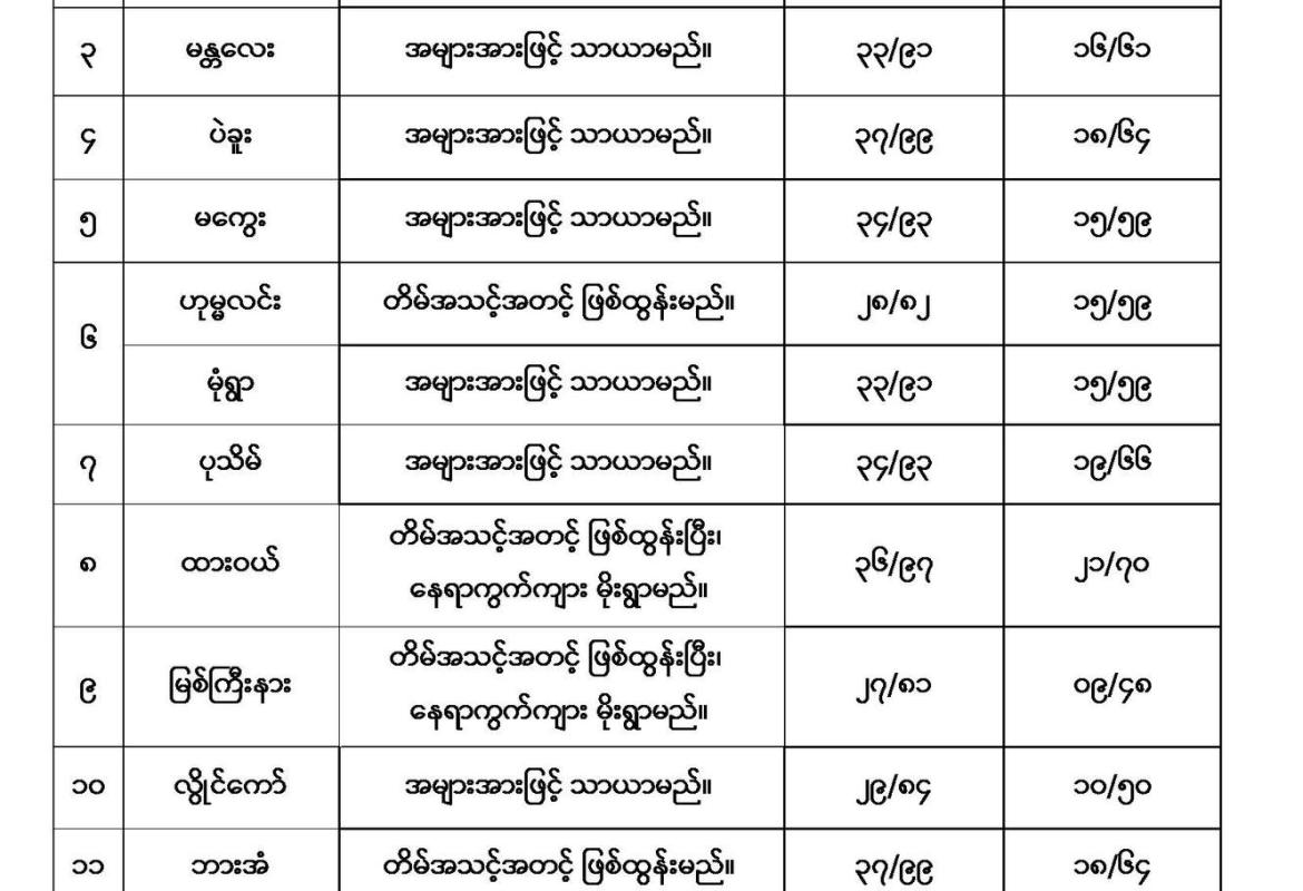 စစ်ကိုင်းတိုင်းဒေသကြီးအထက်ပိုင်း၊ တနင်္သာရီတိုင်းဒေသကြီးနှင့် ကချင်ပြည်နယ်တို့တွင် နေရာကွက်ကျား မိုးအနည်းငယ်ရွာနိုင်