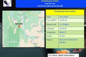 ကန့်ဘလူမြေငလျင်စခန်းမှ မင်းကင်းမြို့၏ အရှေ့တောင်ဘက် (၁၅) မိုင်ခန့်အကွာတွင် အင်အားရစ်(ခ်)တာစကေး (၄.၂) အဆင့်ရှိ မြေငလျင်တစ်ခုလှုပ်ရှား