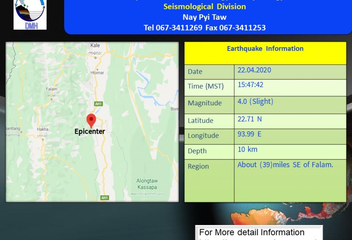 ၂၀၂၀ ပြည့်နှစ်၊ ဧပြီလ (၂၂) ရက်နေ့၊ မြန်မာစံတော်ချိန် (၁၅) နာရီ၊ (၄၇) မိနစ်၊ (၄၂) စက္ကန့် အချိန်တွင် ဟားခါးမြေငလျင်စခန်းမှ အရှေ့-အရှေ့မြောက်ဘက် (၄၁)မိုင်ခန့် ကွာဝေး ............