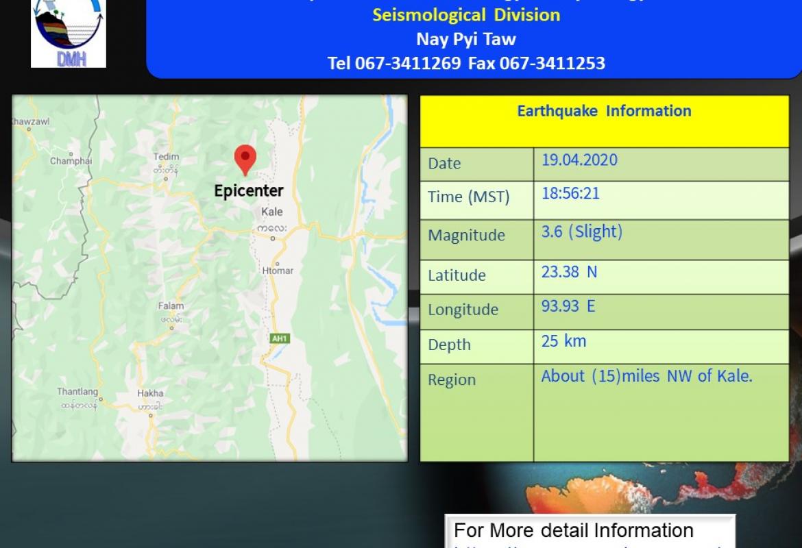 ကလေးမြို့၏ အနောက်မြောက်ဘက်(၁၅)မိုင်ခန့်အကွာတွင် အင်အားအနည်းငယ်ရှိ ငလျင်လှုပ်ခတ်