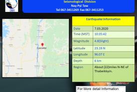 မြန်မာနိုင်ငံ ပြည်တွင်း သပိကျင်မြို့၏ မြောက်-အရှေ့မြောက်ဘက် (၂၂)မိုင် ခန့်အကွာ)၊ မြောက်လတ္တီတွဒ် (၂၃.၁၉) ဒီဂရီ၊ အရှေ့လောင်ဂျီတွဒ် (၉၆.ဝ၇) ဒီဂရီ၊ အနက် (၆) ကီလိုမီတာကို ဗဟိုပြု၍ အင်အားရစ်(ခ်)တာစကေး (၄.၈) အဆင့်ရှိ အင်အားအနည်းငယ်ရှိသော မြေငလျင်တစ်ခု လှုပ်ရှား