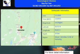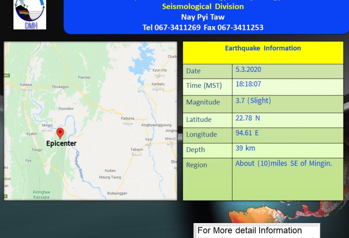 မြစ်ကြီးနားမြေငလျင်စခန်းမှ အနောက်-အနောက်မြောက်ဘက် (၄၃)မိုင် ခန့်ကွာဝေး သော မြန်မာနိုင်ငံပြည်တွင်း (ကာမိုင်းမြို့၏ မြောက်-အရှေ့မြောက်ဘက် (၁၈)မိုင် ခန့်အကွာ)၊ မြောက်လတ္တီတွဒ် (၂၅.၇၅) ဒီဂရီ၊ အရှေ့လောင်ဂျီတွဒ် (၉၆.၈၃)ဒီဂရီ၊ အနက်(၁၀)ကီလိုမီတာ ခန့်ကို ဗဟိုပြု၍ အင်အားရစ်(ခ်)တာစကေး(၄.၄)အဆင့်ရှိ အင်အားအနည်းငယ်ရှိသော မြေငလျင် တစ်ခု လှုပ်ရှားသွားကြောင်း