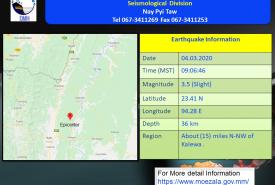 ၂၀၂၀ ပြည့်နှစ်၊ မတ်လ (၄)ရက်နေ့၊ မြန်မာစံတော်ချိန် (၀၆)နာရီ၊ (၅၀)မိနစ်၊ (၀၁)စက္ကန့် အချိန်တွင် ကန့်ဘလူမြေငလျင်စခန်းမှ အရှေ့မြောက်ဘက် (၉၄)မိုင် ခန့်ကွာဝေးသော မြန်မာနိုင်ငံပြည်တွင်း (ကသာမြို့၏ အနောက်မြောက်ဘက် (၂၁)မိုင် ခန့်အကွာ)