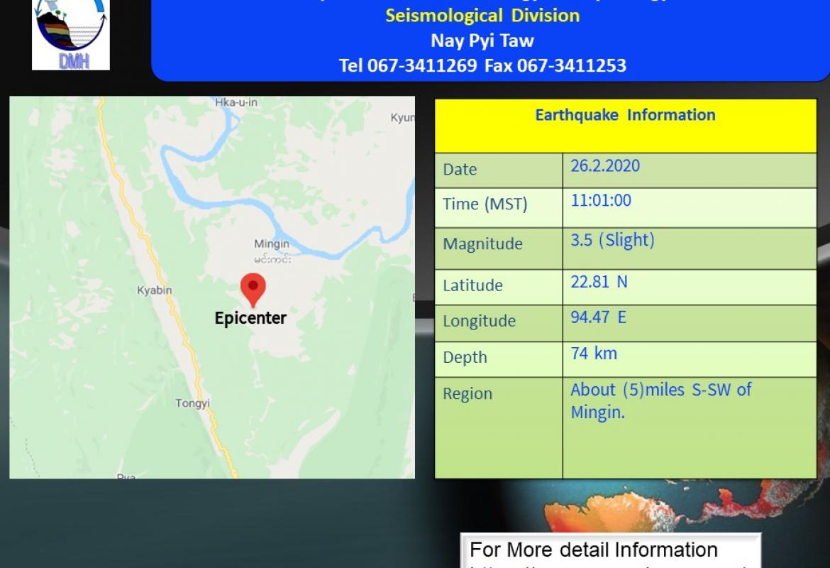 မင်းကင်းမြို့အနီး အင်အားအနည်းငယ်ရှိ မြေငလျင်တစ်ခုလှုပ်ရှား