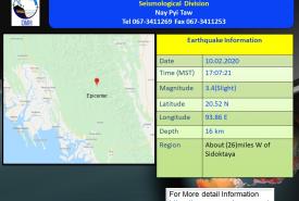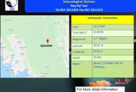 ယနေ့ မြန်မာစံတော်ချိန် နံနက် ၁ နာရီ၊ မိနစ် ၄၀ ၊ (၄၆) စက္ကန့် အချိန်တွင် စစ်တွေမြေငလျင်စခန်းမှ အရှေ့မြောက်ဘက် (၇၃)မိုင် ခန့်ကွာဝေးသော မြန်မာနိုင်ငံ ပြည်တွင်း ( စေတုတ္တရာမြို့၏ အနောက်မြောက် (၂၃)မိုင် ခန့်အကွာ)၊ မြောက်လတ္တီတွဒ် (၂၀.၅၇) ဒီဂရီ၊ အရှေ့လောင်ဂျီတွဒ် (၉၃.၉၁) ဒီဂရီ၊ အနက်(၁၄) ကီလိုမီတာခန့်ကို ဗဟိုပြု၍ အင်အားရစ်(ခ်)တာ စကေး(၄.၇)အဆင့်ရှိ အင်အား အနည်းငယ်ရှိသော မြေငလျင်တစ်ခု လှုပ်ရှားသွားကြောင်း မိုးလေဝသနှင့် ဇလဗေဒညွှန်ကြားမှု ဦးစီးဌာန၏ ထုတ်ပြန်ချက်အရ သိရ