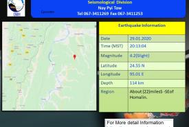၂၀၂၀ ပြည့်နှစ်၊ ဇန်နဝါရီလ (၂၉)ရက်နေ့၊ မြန်မာစံတော်ချိန် (၂၀)နာရီ၊ (၁၃)မိနစ်၊ (၀၄)စက္ကန့် အချိန်တွင်တမူးမြေငလျင်စခန်းမှ အရှေ့မြောက်ဘက် မိုင် (၅၀) ခန့်ကွာဝေးသော၊ မြန်မာနိုင်ငံ ပြည်တွင်း (ဟုမ္မလင်းမြို့၏ တောင်-အရှေ့တောင်ဘက် (၂၂)မိုင် ခန့်အကွာ)၊