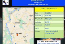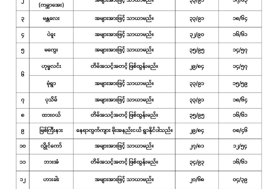 ယနေ့ညနေအထိခန့်မှန်းချက်မှာ ကချင်ပြည်နယ်တွင် နေရာကွက်ကျား မိုးအနည်းငယ်ရွာနိုင်