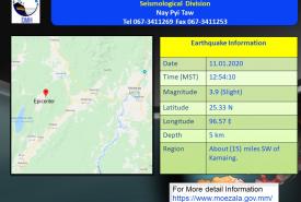 ၂၀၂၀ ပြည့်နှစ်၊ ဇန်နဝါရီလ (၁၁) ရက်နေ့၊ မြန်မာစံတော်ချိန် (၁၂)နာရီ၊ (၅၄)မိနစ်၊ (၁၀) စက္ကန့်အချိန်တွင် မြစ်ကြီးနားမြေငလျင်စခန်းမှ အနောက်-အနောက်တောင်ဘက် (၅၈)မိုင် ခန့်ကွာဝေးသော၊ ...............