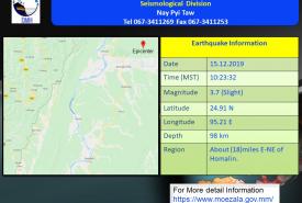 ယနေ့နံနက် ၁၀ နာရီ ၂၃ မိနစ်တွင် ဟုမ္မလင်းမြို့၏ အရှေ့-အရှေ့မြောက်ဘက် (၁၈)မိုင်ခန့်အကွာကို ဗဟိုပြု၍