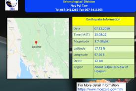 ၂၀၁၉ ခုနှစ် ဒီဇင်ဘာလ ၇ ရက် မြန်မာစံတော်ချိန် (၂၃)နာရီ၊ (၀၈)မိနစ်၊ (၂၂) စက္ကန့်အချိန်တွင် ဘားအံမြေငလျင်စခန်းမှ