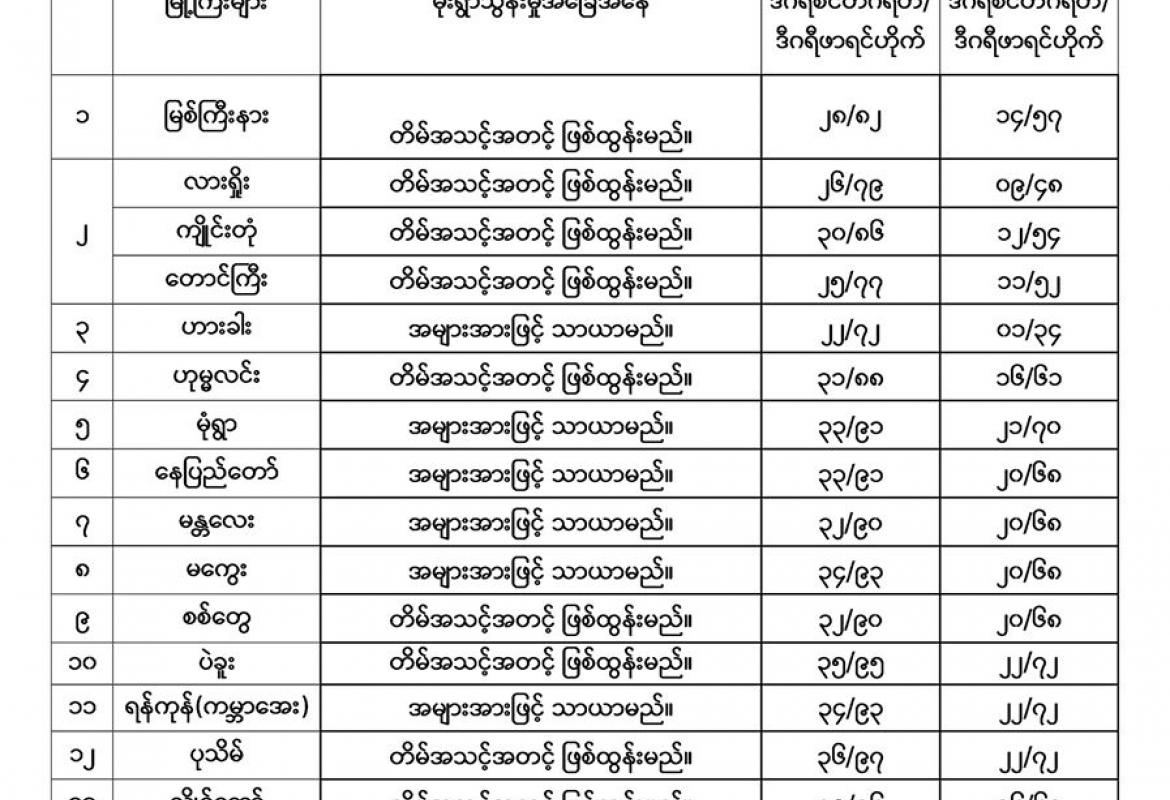 မိုးလေဝသနှင့် ဇလဗေဒညွှန်ကြားမှုဦးစီးဌာနမှ (၂၃.၁၁.၂၀၁၉) ရက်နေ့ နံနက်(၀၆:၃၀) နာရီအချိန်တွင် တိုင်းတာရရှိသော မြစ်ရေအခြေအနေများ .............