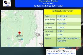 မြစ်ကြီးနားမြို့၏ မြောက်-အနောက်မြောက်ဘက် (၃၈)မိုင်ခန့်အကွာတွင် ၃ ဒသမ ၉ အဆင့်ရှိ မြေငလျင်လှုပ်ခတ်