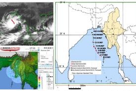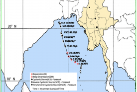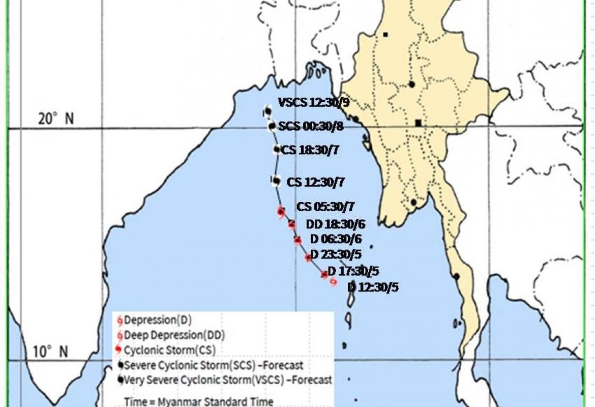 ဘင်္ဂလားပင်လယ်အော် အခြေအနေ။ ယနေ့မြန်မာစံတော်ချိန် ၆ နာရီခွဲအချိန် တိုင်းထွာချက်များ အရ ဘင်္ဂလားပင်လယ် အော်အရှေ့အလယ်ပိုင်းနှင့် ယင်းနှင့်ဆက်စပ်လျက်ရှိသော ဘင်္ဂလား ပင်လယ်အော် အရှေ့တောင်ပိုင်းတွင် ဖြစ်ပေါ်နေသော မုန်တိုင်းငယ်(Depression)သည် အနောက်ဘက်သို့ ရွေ့လျားခဲ့ပြီး အိန္ဒိယနိုင်ငံ၊ မာယာဘန်ဒါမြို့ (Maya Bandar) (ကပ္ပလီကျွန်း-Andaman Islands)၏ အနောက်-အနောက်မြောက်ဘက် ရေမိုင် (၁၈၀)မိုင်ခန့်၊ ပါရာဒစ်ပ်မြို့ (Paradip)(ဩရိဿ-Odisha)၏ အရှေ့တောင်ဘက် ရေမိုင် (၄၆၀)မိုင်ခန့်၊ မြန်မာနိုင်ငံ၊ ပုသိမ်မြို့ (Pathein)၏ အနောက်တောင်ဘက် ရေမိုင် (၃၅၅)မိုင်ခန့်နှင့် ဂွမြို့(Gwa)၏ အနောက်တောင်ဘက် ရေမိုင် (၃၈၀) မိုင်ခန့်အကွာ ပင်လယ်ပြင်ကို ဗဟိုပြုနေ