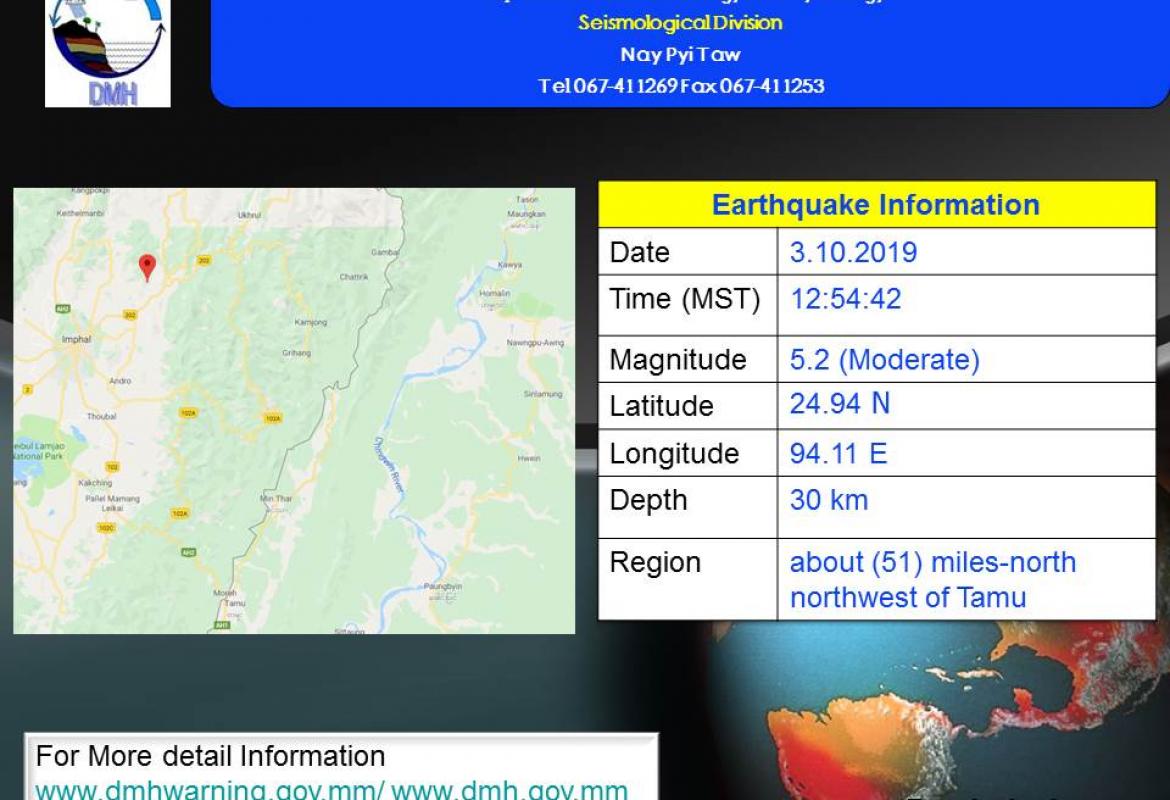 ၂၀၁၉ ခုနှစ်၊ အောက်တိုဘာလ (၃)ရက်နေ့၊ မြန်မာစံတော်ချိန် (၁၂)နာရီ၊ (၅၄)မိနစ်၊ (၄၂)စက္ကန့် အချိန်တွင် တမူးမြေငလျင်စခန်းမှ မြောက်-အနောက်မြောက်ဘက် (၅၁)မိုင် ခန့်ကွာဝေးသော မြန်မာနိုင်ငံ ပြည်ပ (Myanmar-India Border Region) မြောက်လတ္တီတွဒ် (၂၄.၉၄)ဒီဂရီ၊ အရှေ့လောင်ဂျီတွဒ် (၉၄.၁၁)ဒီဂရီ၊ အနက်(၃၀)ကီလိုမီတာကို ဗဟိုပြု၍ အင်အားရစ်(ခ်)တာစကေး (၅.၂) အဆင့်ရှိ အင်အားအသင့်အတင့်ရှိသော မြေငလျင်တစ်ခု လှုပ်ရှားသွားကြောင်း မိုးဇလမှ တိုင်းထွာရရှိကြောင်း ထုတ်ပြန်ထား