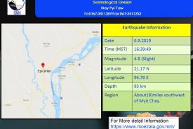 စက်တင်ဘာလ (၆)ရက်နေ့၊ မြန်မာစံတော်ချိန် ညနေ ၄ နာရီ ၃၉ မိနစ်၊ ၄၉ စက္ကန့်တွင် ညောင်ဦးမြေငလျင်စခန်းမှ အနောက်- အနောက်တောင်ဘက် (၁၀)မိုင်ခန့်ကွာဝေးသော မြန်မာနိုင်ငံ ပြည်တွင်း၊ (မြစ်ခြေမြို့၏ အနောက်တောင်ဘက်(၈)မိုင်ခန့်အကွာ)ကို ဗဟိုပြုကာ အင်အားရစ်(ခ်)တာစကေး (၄.၈) အဆင့်ရှိအင်အားအနည်းငယ်ရှိသော မြေငလျင်တစ်ခု လှုပ်ရှားသွားကြောင်း မိုးလေဝသနှင့်ဇလဗေဒညွှန်ကြားမှုဦးစီးဌာနမှ သိရသည်။