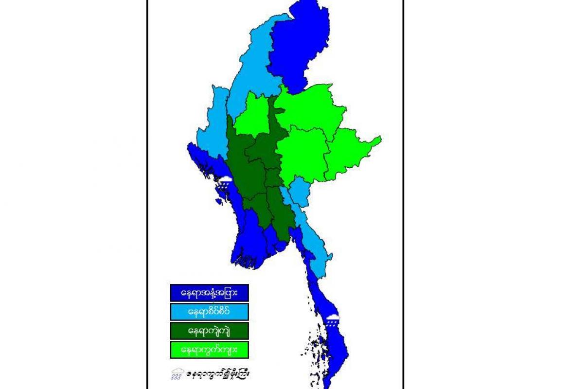လာမည့်စနေ၊ တနင်္ဂနွေအားလပ်ရက်များတွင် နေပြည်တော်နှင့် မန္တလေးတိုင်း ဒေသကြီးတို့တွင် နေရာကျဲကျဲနှင့် ရန်ကုန်တိုင်းဒေသကြီးတွင် နေရာစိပ်စိပ် မိုးထစ်ချုန်းရွာနိုင်