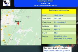 ဟုမ္မလင်းမြို့အနီး ၅ ဒသမ ၂ အဆင့်ရှိ အင်အားအသင့်အတင့် ငလျင်လှုပ်