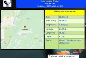 ဟုမ္မလင်းမြို့၏ အရှေ့မြောက်ဘက် (၁၈)မိုင်ခန့်အကွာကို ဗဟိုပြုပြီး အင်အား အနည်းငယ် ငလျင်လှုပ်