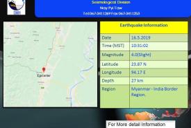 ယနေ့ မြန်မာစံတော်ချိန် နံနက် ၁၀ နာရီ (၃၁)မိနစ်၊ (ဝ၂)စက္ကန့် အချိန်တွင် တမူးမြေငလျင်စခန်းမှ တောင်-အနောက်တောင်ဘက် (၂၅)မိုင် ခန့်ကွာဝေးသော (Myanmar – India Border Region) မြောက်လတ္တီတွဒ် (၂၃.၈၇)ဒီဂရီ၊ အရှေ့လောင်ဂျီတွဒ် (၉၄.၁၇) ဒီဂရီ၊ အနက် (၂၇)ကီလိုမီတာကို ဗဟိုပြု၍ အင်အားရစ်(ခ်)တာစကေး (၄.ဝ) အဆင့်ရှိ အင်အားအနည်းငယ်ရှိသော မြေငလျင်တစ်ခု လှုပ်ရှားသွားကြောင်း မိုးလေဝသနှင့်ဇလဗေဒညွှန်ကြားမှုဦးစီးဌာနမှ သိရသည်။