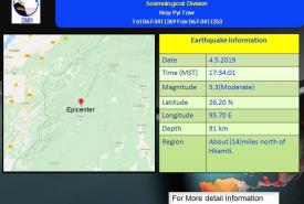 မိုးလေဝသနှင့် ဇလဗေဒညွှန်ကြားမှု ဦးစီးဌာနမှ မေ ၄ ရက် ညနေ ၄ နာရီတွင် အချိန် ထုတ်ပြန်သည့် မွန်းလွဲ ၃ နာရီခွဲ တိုင်းထွာချက်များအရ ဘင်္ဂလားဒေ့ရှ်နိုင်ငံနှင့် ယင်းနှင့် ဆက်စပ်လျှက်ရှိသော အိန္ဒိယနိုင်ငံ၊ အနောက်ဘင်္ဂလားပြည်နယ်တို့ ပေါ်တွင် ရောက်ရှိနေသော အားကောင်းသော မုန်တိုင်းငယ် (Deep Depression) သည် အရှေ့မြောက်ဘက်သို့ ရွေ့လျားခဲ့ပြီး မုန်တိုင်းငယ် (Depression) အဖြစ်သို့ အားလျော့သွားခဲ့ကာ ဘင်္ဂလားဒေ့ရှ်နိုင်ငံ၊ ဒါကာမြို့ (Dhaka) ၏ မြောက်-အနောက်မြောက်ဘက် (၆၅) မိုင်ခန့်အကွာတွင် ဆက်လက်တည်ရှိနေသည်။