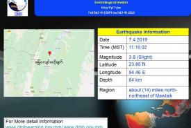 ၂၀၁၉ ခုနှစ်၊ ဧပြီလ (၇)ရက်နေ့၊ မြန်မာစံတော်ချိန် (၁၁)နာရီ၊ (၁၆)မိနစ်၊ (ဝ၂)စက္ကန့် အချိန်တွင် တမူးမြေငလျင်စခန်းမှ တောင်-အရှေ့တောင်ဘက် (၂၇) မိုင်ခန့် ကွာဝေးသော မြန်မာနိုင်ငံပြည်တွင်း (မော်လိုက်မြို့၏ မြောက်-အရှေ့မြောက်ဘက် (၁၄)မိုင်ခန့် အကွာ) မြောက်လတ္တီတွဒ် (၂၃.၈၅) ဒီဂရီ၊ အရှေ့လောင်ဂျီတွဒ် (၉၄.၄၆) ဒီဂရီ၊ အနက်(၆၄)ကီလိုမီတာကို ဗဟိုပြု၍ အင်အားရစ်(ခ်)တာစကေး (၃.၈) အဆင့်ရှိ အင်အား အနည်းငယ်ရှိသော မြေငလျင်တစ်ခု လှုပ်ရှားသွားကြောင်း မိုးဇလမှ ထုတ်ပြန်ထားသည်။