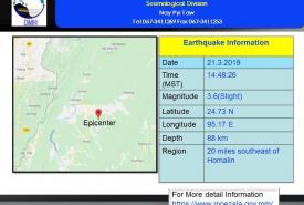 ၂၀၁၉ ခုနှစ် ၊ မတ်လ (၂၁)ရက်နေ့ မြန်မာစံတော်ချိန် (၁၄)နာရီ (၄၈)မိနစ် (၂၆)စက္ကန့် အချိန်တွင် တမူးမြေငလျင်စခန်းမှ အရှေ့မြောက်ဘက် (၆၄)မိုင်ခန့် ကွာဝေးသော ------