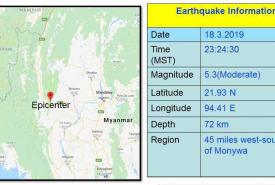 မြန်မာနိုင်ငံအတွင်း မုံရွာမြို့၏ အနောက်-အနောက်တောင်ဘက် (၄၅)မိုင်ခန့်အကွာ ဗဟိုချက်၊ အနက် (၇၂)ကီလိုမီတာခန့်ကို ဗဟိုပြု၍ အင်အားရစ်(ချ်)တာစကေး (၅ ဒသမ ၃) အဆင့်ရှိ အင်အားအသင့်အတင့်ရှိသော မြေငလျင်တစ်ခု မတ် (၁၈)ရက် ညပိုင်းက လှုပ်ရှားသွားကြောင်း မိုးလေဝသနှင့် ဇလဗေဒညွန်ကြားမှုဦးစီးဌာန၏ သတင်းထုတ်ပြန်ချက်အရ သိရသည်။