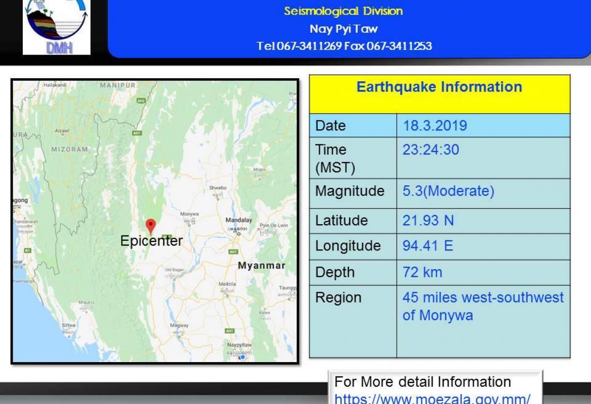 မုံရွာမြို့၏ အနောက်တောင်ဘက် အင်အားရစ်(ခ်)တာစကေး (၅ ဒသမ ၃) အဆင့်ရှိ မြေငလျင်တစ်ခု လှုပ်ခတ်