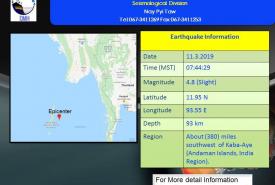မြန်မာနိုင်ငံပြည်ပ (Andaman Islands, India Region)ကို ဗဟိုပြုပြီး (၄.၈)အဆင့်ရှိ အင်အားအနည်းငယ် မြေငလျင်လှုပ်