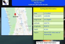 မြန်အောင်မြို့အနီး အင်အားအနည်းငယ်ရှိ မြေငလျင်လှုပ်