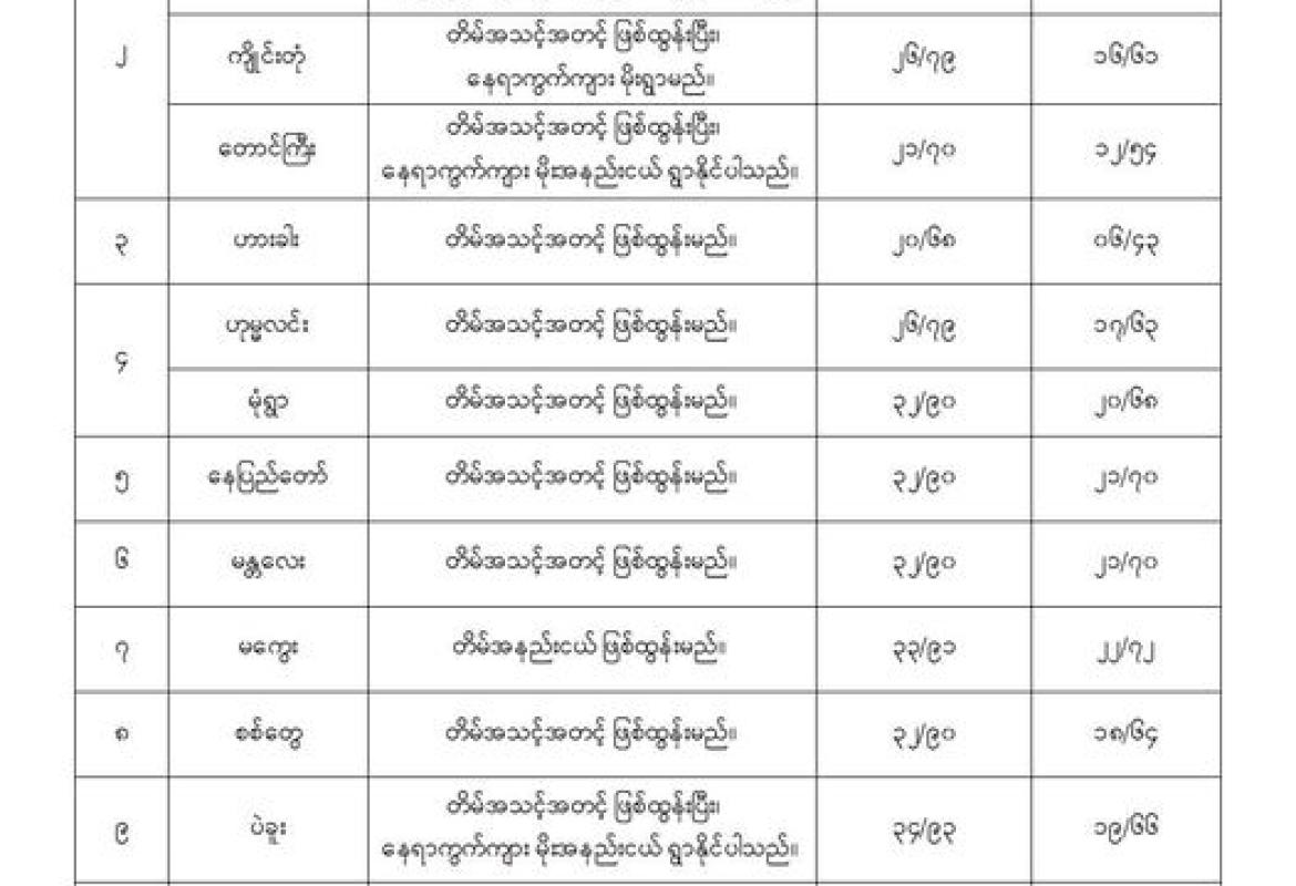 စစ်ကိုင်းတိုင်းဒေသကြီးအထက်ပိုင်း၊ တနင်္သာရီတိုင်းဒေသကြီး၊ ကချင်ပြည်နယ်နှင့် ရှမ်းပြည်နယ်တို့တွင် နေရာကွက်ကျား မိုးရွာနိုင်