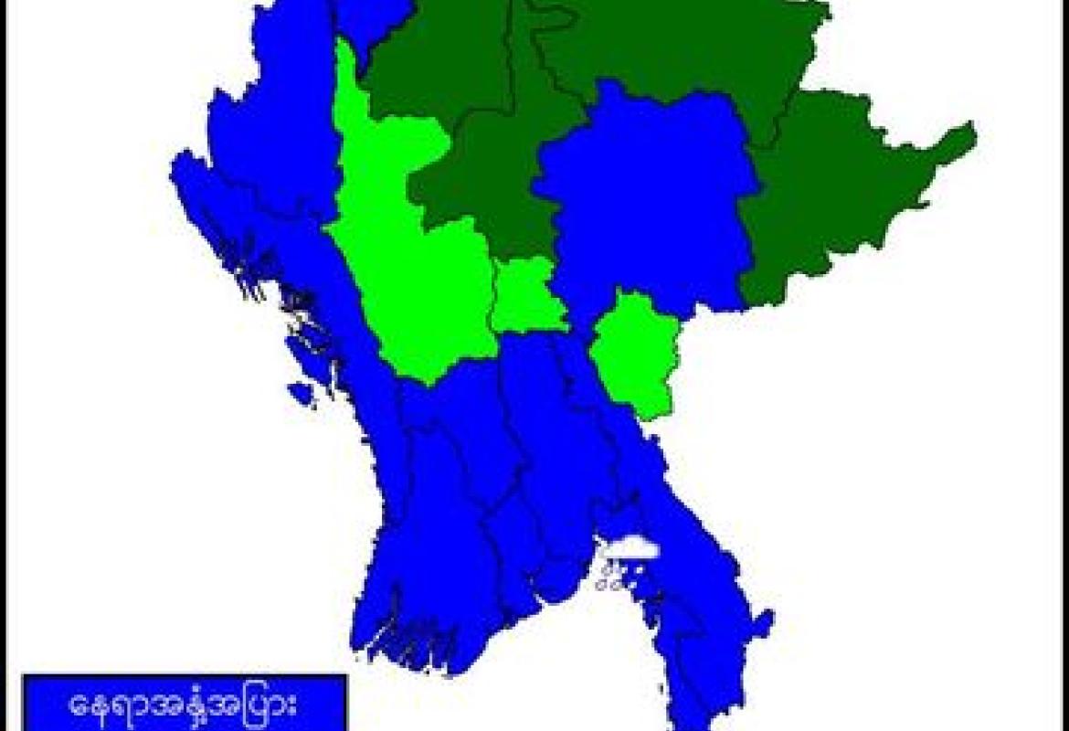 မကွေးတိုင်းဒေသကြီးနှင့် ကယားပြည်နယ်တို့တွင် နေရာကျဲကျဲ၊ စစ်ကိုင်းတိုင်းဒေသကြီးအောက်ပိုင်း၊ မန္တလေးတိုင်းဒေသကြီးနှင့် ရှမ်းပြည်နယ်(မြောက်ပိုင်းနှင့် အရှေ့ပိုင်း)တို့တွင် နေရာစိပ်စိပ်နှင့် မိုးထစ်ချုန်း ရွာမည်