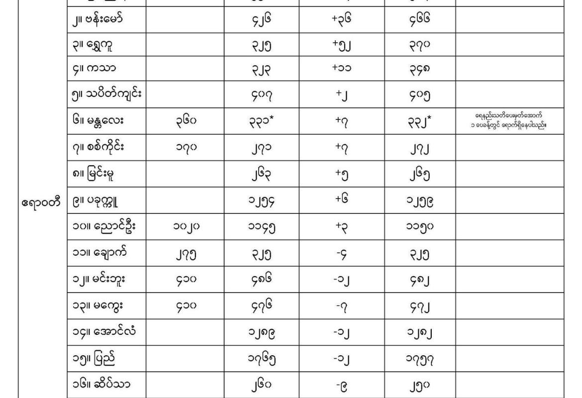 မနက်ဖြန်နံနက်အထိခန့်မှန်းချက်။ စစ်ကိုင်းတိုင်းဒေသကြီးအထက်ပိုင်း၊ ကချင်ပြည်နယ်၊ ရှမ်းပြည်နယ် (မြောက်ပိုင်းနှင့်တောင်ပိုင်း)နှင့် ချင်းပြည်နယ်တို့တွင် နေရာကွက်ကျား မိုးထစ်ချုန်းရွာမည်။ ရွာရန်ရာနှုန်း ၈၀ ဖြစ်ပါသည်။ ကျန်တိုင်းဒေသကြီးနှင့် ပြည်နယ်တို့တွင် တိမ်အသင့်အတင့် ဖြစ်ထွန်းမည်။