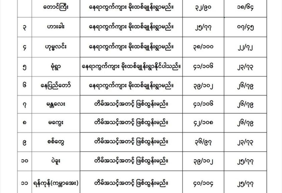 မနက်ဖြန်နံနက်အထိခန့်မှန်းချက်။ နေပြည်တော်၊ စစ်ကိုင်းတိုင်းဒေသကြီး၊ မန္တလေးတိုင်းဒေသကြီး၊ တနင်္သာရီတိုင်းဒေသကြီး၊ ကချင်ပြည်နယ်၊ ရှမ်းပြည်နယ်၊ ချင်းပြည်နယ်၊ ကယားပြည်နယ်၊ ကရင်ပြည်နယ်နှင့် မွန်ပြည်နယ်တို့တွင် နေရာကွက်ကျား မိုးထစ်ချုန်းရွာမည်။ ရွာရန်ရာနှုန်း ၈၀ ဖြစ်ပါသည်။ ကျန်တိုင်း ဒေသကြီးနှင့် ပြည်နယ်တို့တွင် တိမ်အသင့်အတင့် ဖြစ်ထွန်းမည်။