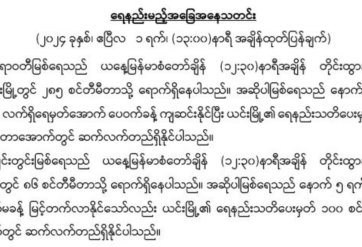 မနက်ဖြန်နံနက်အထိခန့်မှန်းချက်။ စစ်ကိုင်းတိုင်းဒေသကြီးအထက်ပိုင်း၊ မန္တလေးတိုင်းဒေသကြီး၊ တနင်္သာရီတိုင်းဒေသကြီး၊ ကချင်ပြည်နယ်၊ ရှမ်းပြည်နယ်(မြောက်ပိုင်း)၊ ချင်းပြည်နယ်နှင့် ရခိုင်ပြည်နယ်တို့တွင် နေရာကွက်ကျား မိုးအနည်းငယ် ထစ်ချုန်းရွာနိုင်ပါသည်။ ရွာရန်ရာနှုန်း(၆၀) ဖြစ်ပါသည်။ ကျန်တိုင်းဒေသကြီးနှင့် ပြည်နယ်တို့တွင် တိမ်အသင့်အတင့် ဖြစ်ထွန်းမည်။