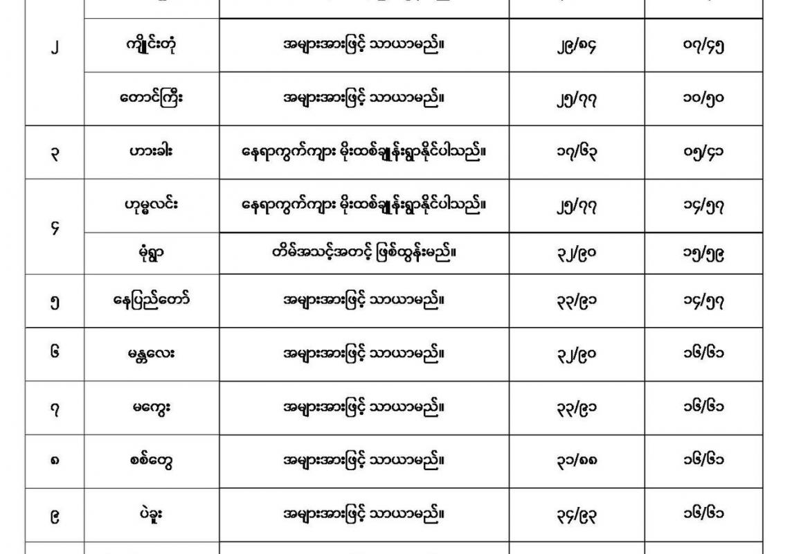ကချင်ပြည်နယ်တွင်နေရာကျဲကျဲနှင့်စစ်ကိုင်းတိုင်းဒေသကြီးအထက်ပိုင်းနှင့်ချင်းပြည်နယ်တို့တွင် နေရာကွက်ကျားမိုးထစ်ချုန်းရွာမည်