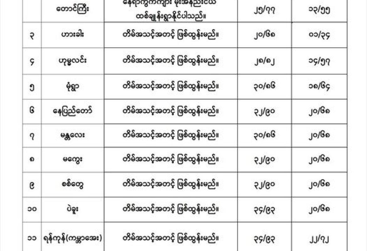မနက်ဖြန်အတွက် တိုင်းဒေသကြီးနှင့် ပြည်နယ်များရှိ မြို့ကြီးများ၏ အမြင့်ဆုံးအပူချိန်၊ အနိမ့်ဆုံးအပူချိန်နှင့် မိုးလေဝသခန့်မှန်းချက်
